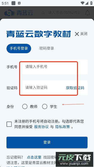 打开应用程序后,学生需选择学生身份并使用手机号码完成登录或注册流程。