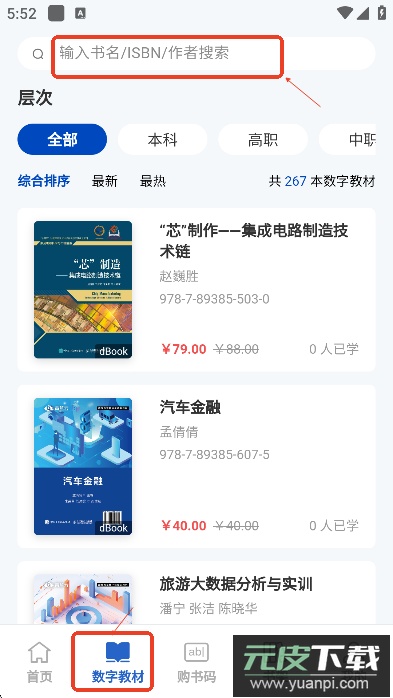 学生可通过顶部搜索栏查找所需教材,支持输入书籍名称、ISBN编码或作者姓名进行检索。