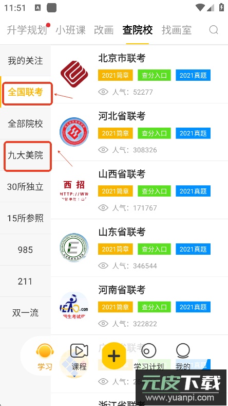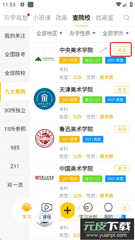 在查询页面,用户可以关注感兴趣的院校,也可以直接关注全国九大美术学院。