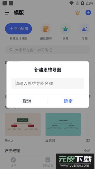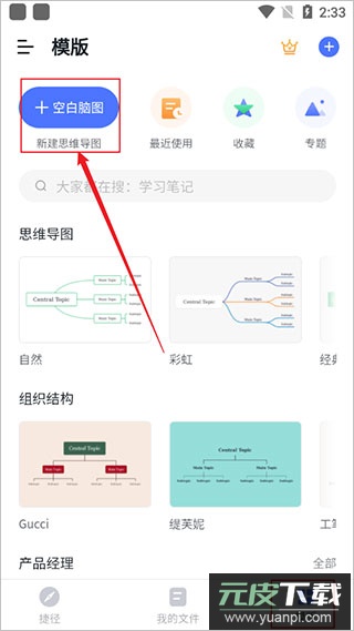 1、打开ProcessOn官方版应用,在模板区域选择空白脑图或新建思维导图开始创作;