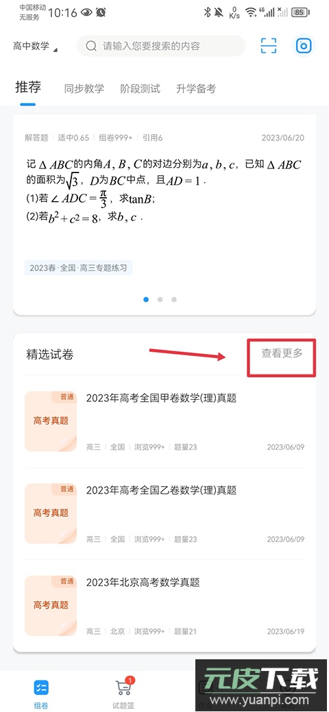 1、进入应用组卷专区,点击“查看更多好试卷”选项。