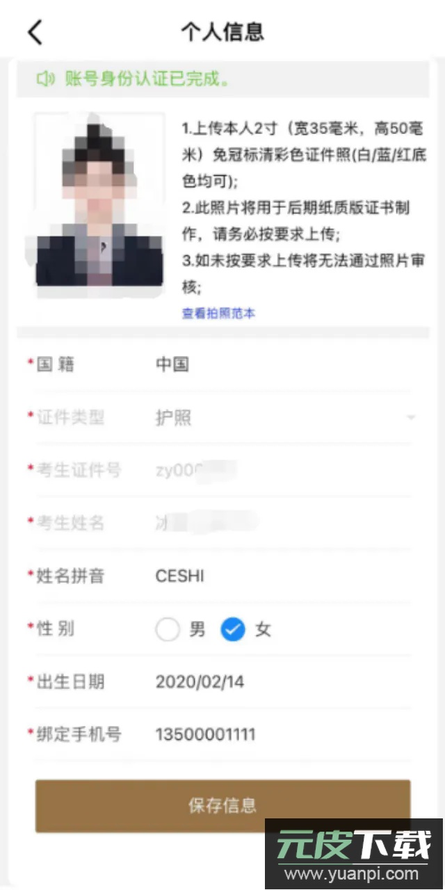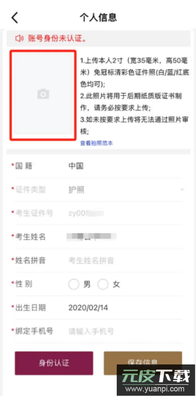 2、在个人信息页面上传本人的两寸免冠电子照片。
