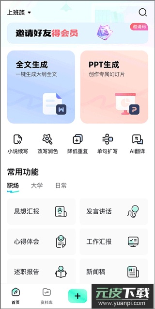 1、打开应用程序,在主页面找到并点击全文生成选项,进入写作模板界面。