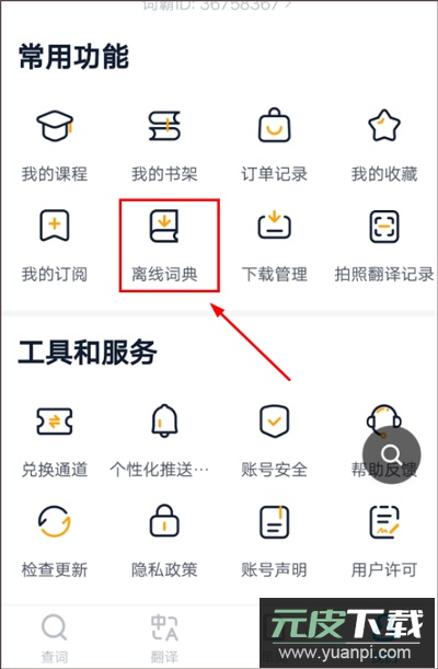 2、在个人页面找到常用功能区的“离线词典”,点击进入;
