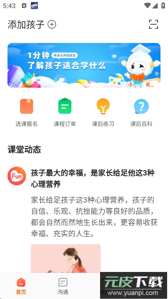 设有选课报名、课程订单、课后练习与课后百科等入口,同时推送课堂相关的动态资讯。