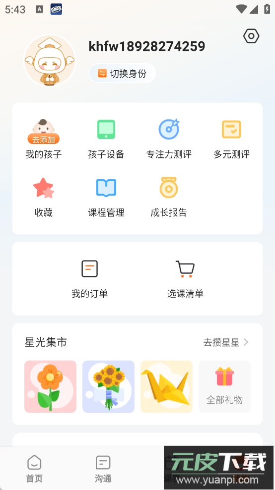 集中管理孩子信息、设备绑定、学习测评、课程订单等内容,并设有星光集市供积分兑换礼品。