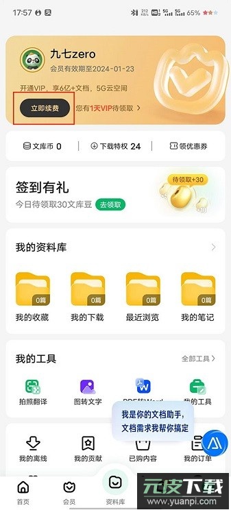 1、在个人中心页面,找到并点击立即续费选项;
