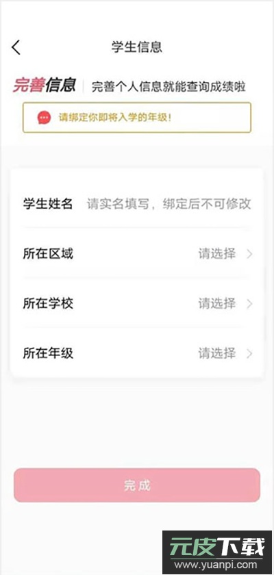 6、输入新的学生信息,包括姓名、学校、年级等,点击完成绑定即可;请注意,信息绑定后将无法再次修改。