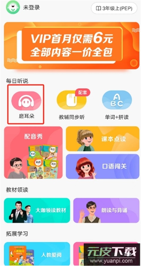 1、首先在手机上打开人教口语应用,在主界面找到并点击磨耳朵功能入口;
