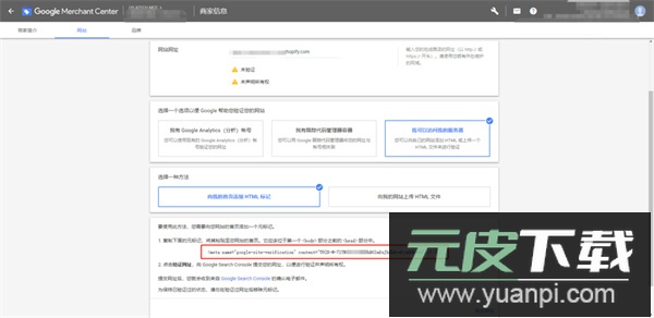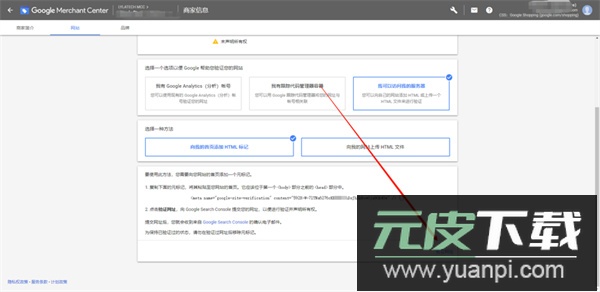 1、进入Google Merchant Center后台,点击设置图标,选择“商家信息”,并选取一种验证方式,建议使用添加HTML代码的方法;