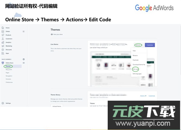 3、登录Shopify后台,依次进入“在线商店”→“主题”→“操作”→“编辑代码”,打开代码编辑界面;