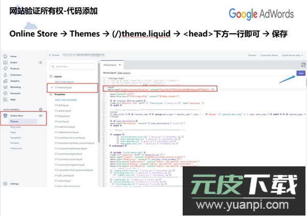 4、在Theme.liquid文件中粘贴已复制的代码,保存修改;