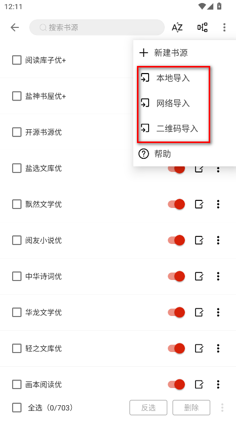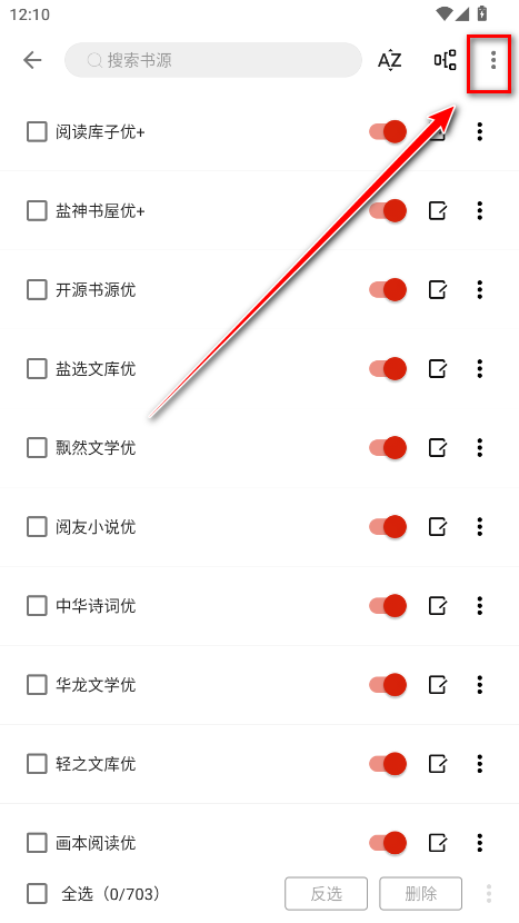 3. 进入书源管理页后,点击右上角由三个点组成的菜单图标。