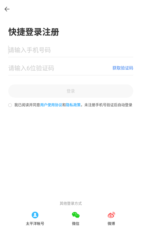 1、打开太平洋科技手机客户端,首先完成账号登录,支持使用手机号快速注册并登录;