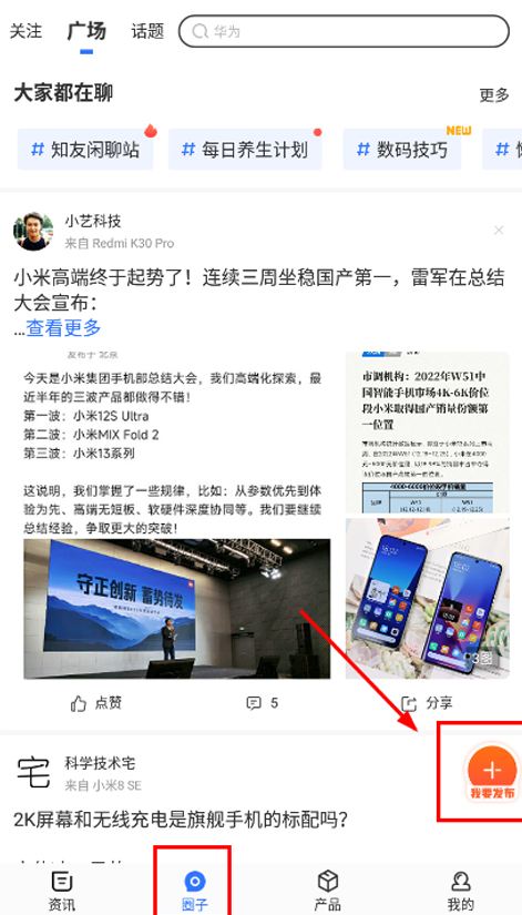 2、接着点击界面下方的“圈子”栏目,然后选择“我要发布”功能;