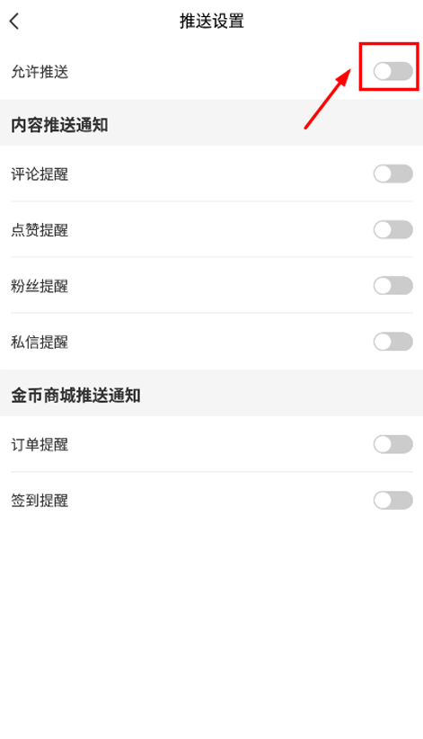 3、最后将“允许推送”旁边的开关按钮关闭,即可停止接收推送消息。