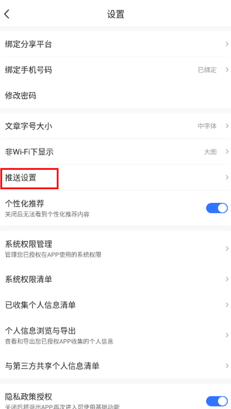2、在设置菜单中找到并点击“推送设置”选项;