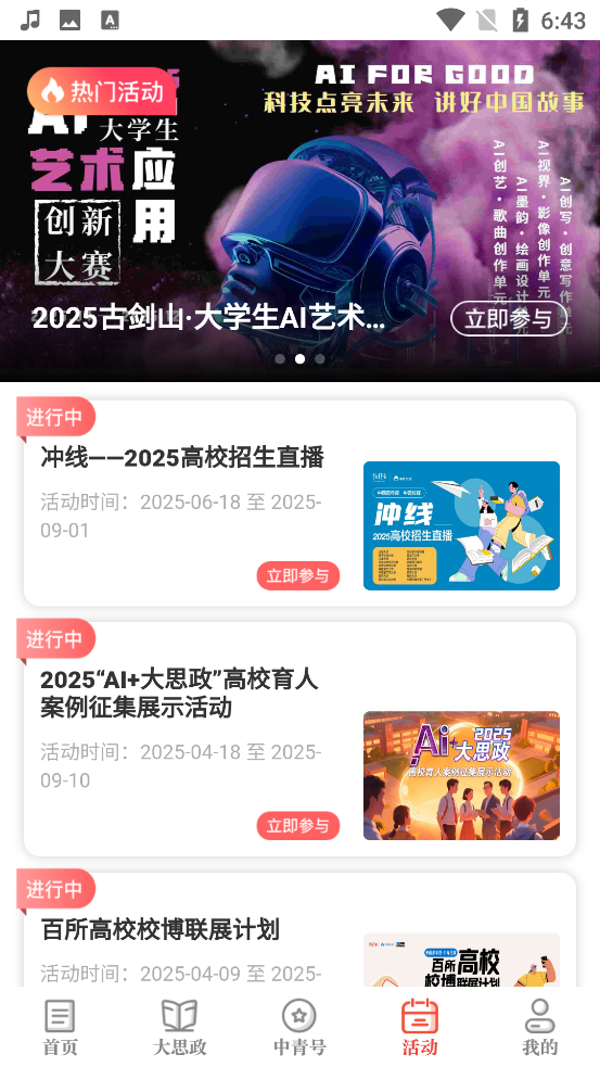 4、互动体验:开设中青号模块,邀请校园媒体、企业及组织入驻,构建交流空间;客户端具备征集、评选、积分等功能,支持多种线上互动活动。