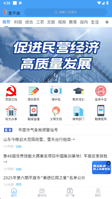 爱平度客户端由平度市融媒体中心运营,是平度市官方指定的政务与新闻信息发布平台。它整合了电视、广播、报纸等传统媒体资源,同时提供政务办理、党建服务、便民查询、互动反馈、文明实践、随手拍、招聘求职、文旅推荐、直播观看、商圈导览及教育培训等多种功能。该应用融合了新闻传播、政务服务与商业合作,帮助用户一站式掌握本地政策、生活、旅游与交通动态,并支持参与问政及各类线上线下活动,是平度地区具有权威性、综合性、实用性的移动新媒体窗口。