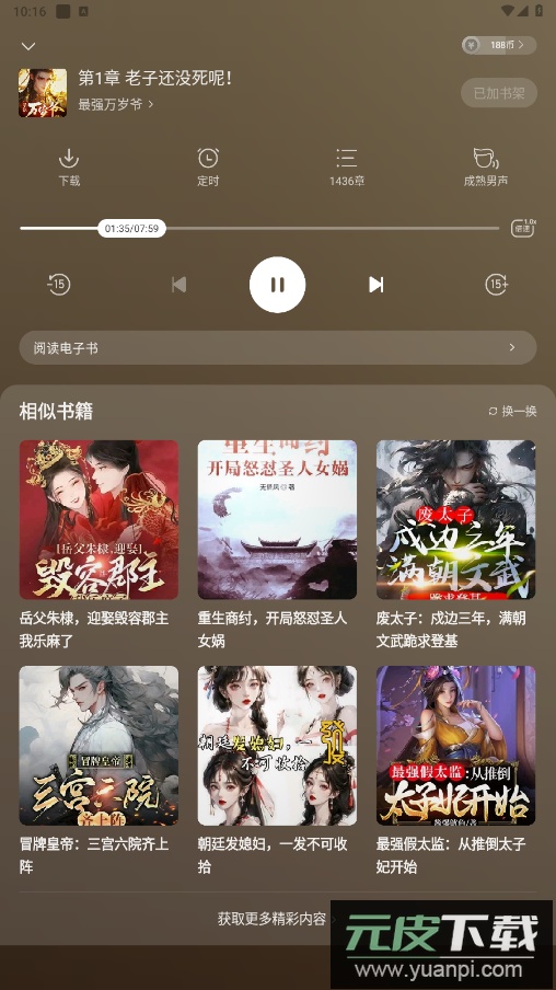 3. 进入听书界面后,可以调整朗读声音、播放速度与定时设置等。