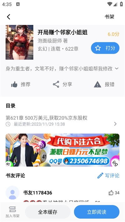 3、在书城中找到感兴趣的小说,点击进入详情页后选择立即阅读;