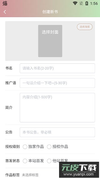 编辑作品的封面、书名、推广语和简介,设置状态与标签,随后按流程提交文字内容,等待平台审核后发布。