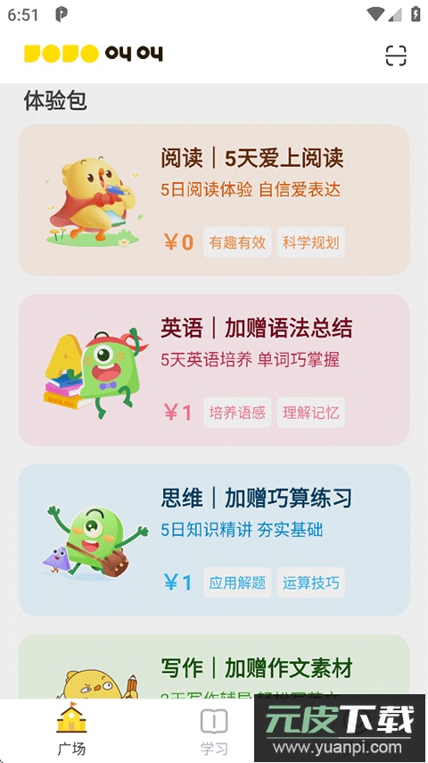 3、首页下方常设有多种0元或1元课程体验包可供选择;