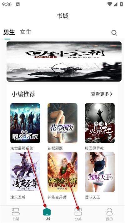 2、打开应用后,可以在书城浏览推荐的小说作品;
