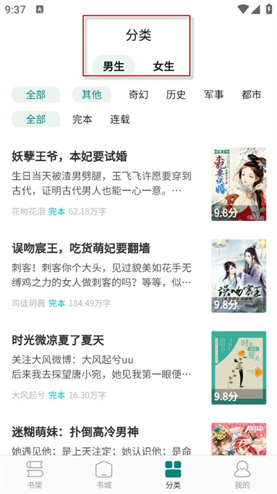 3、通过分类功能,可以查看男生或女生偏好类型的小说;
