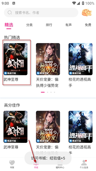 2、进入首页后,点击书城板块,浏览并选择你感兴趣的作品;