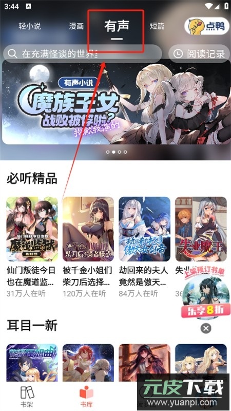2、启动软件后,在界面顶部导航中找到“有声”专区,该板块集中展示了所有可收听的小说资源。
