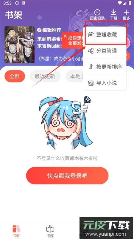 2、在书架界面右上角找到菜单选项,从展开的列表中选择“整理收藏”功能。