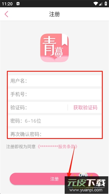 3、在注册页面填写用户名、手机号码及验证码,设置好登录密码,最后点击完成注册。
