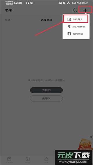 1. 打开应用,进入书架页面,点击右上角的加号图标,选择“本机导入”选项。