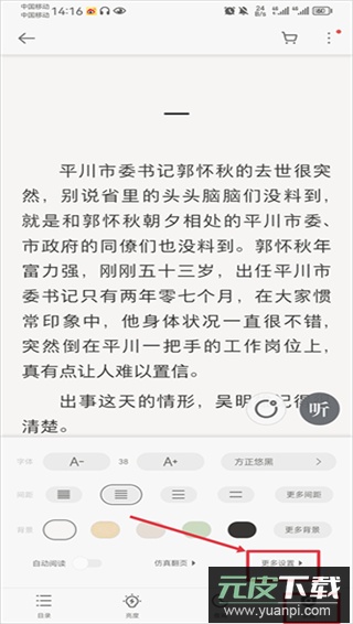 1. 在阅读界面点击屏幕,调出菜单栏,点击右下角的设置图标,进入后选择“更多设置”。