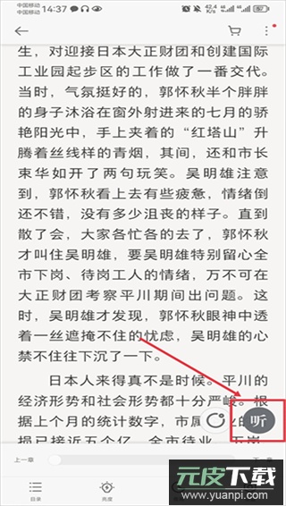 1. 在阅读界面点击屏幕中央,呼出功能菜单,随后点击右下角带有“听”字的按钮。