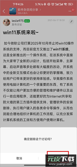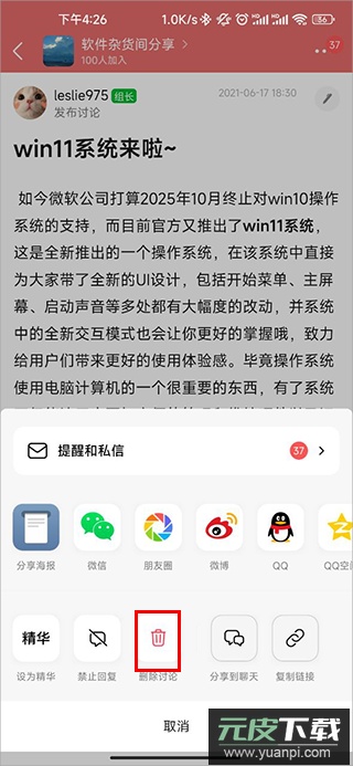 4、在弹出的菜单中,点击“删除讨论”选项;