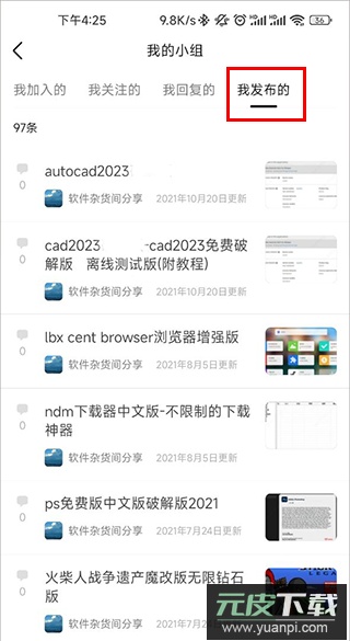 2、在打开的小组页面中,找到并点击“我发布的”栏目;