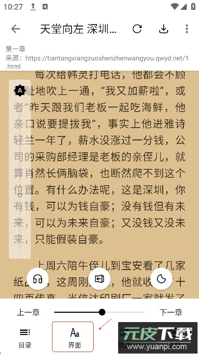 进入阅读界面后,点击“界面”选项可对阅读环境进行个性化设置,包括调整背景、字体样式等参数。