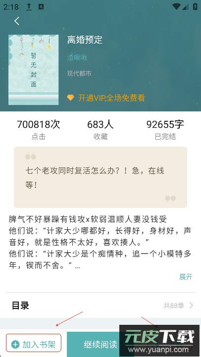 进入小说详情页后,点击“加入书架”可将作品收藏至个人书架;点击“下载”则能将小说保存至本地,实现离线阅读。