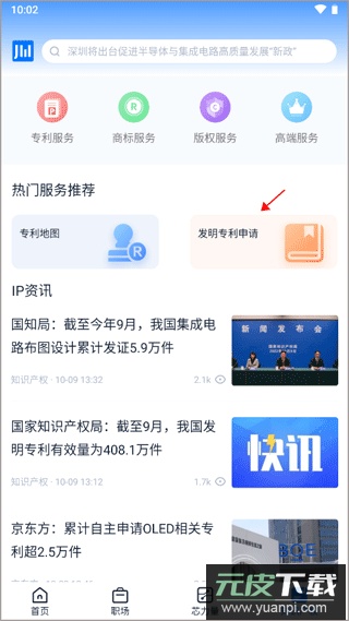 1、进入app首页,切换至知识产权模块,点击页面上方标注的发明专利申请入口;