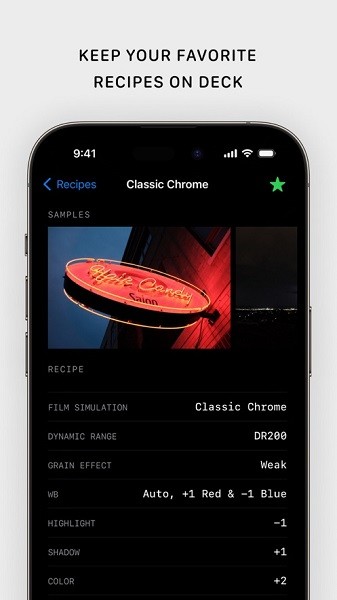 这款免费应用内置上百款适配富士胶片X相机的胶片模拟配方,所有配方的JPEG参数都经过实测校准,设置后直出就能获得不同风格的成片效果,很多配方都还原了经典胶片的成像质感,包括Kodachrome、Portra、Tri-X、Superia、Vista等热门胶片型号;只要你手中的设备是富士胶片X系列相机,都能在应用里找到完全适配的胶片模拟配方,是富士X系列摄影师必备的实用工具,选中想要的配方,对照调整相机JPEG参数就能直接拍摄。