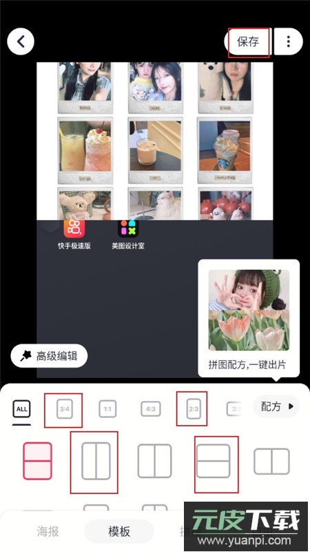 3.系统会自动对选中的图片进行快速拼接,你可以在这个界面对拼图的版式、图片比例进行调整,所有参数都设置完成后,点击右上角的“保存”按钮就完成操作了。