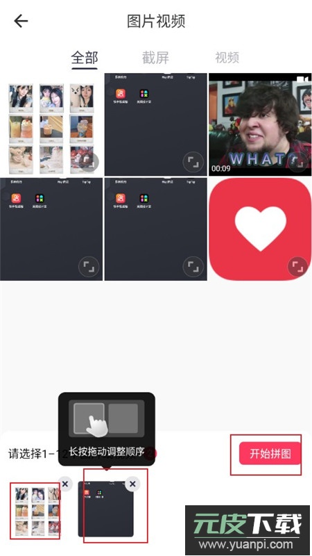 2.进入拼图界面后选择需要拼接的照片,你可以根据选图数量选择不同的布局模板,比如2张、3张、4张对应的专属模板,选好照片之后点击“开始拼图”按钮。