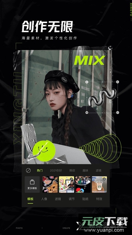 2、上线多种新潮修图玩法,还有数十款原创潮流风格素材,支持用户自由叠加组合;