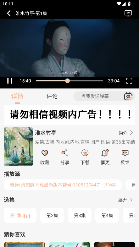 6. 进入详情页面之后,还能使用软件的下载、收藏、分享、催更、投屏、发送弹幕、查看弹幕等功能;