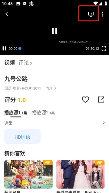4.点击视频播放窗口的空白处,可以弹出相对应的播放功能菜单,在右上角点击电视图标;