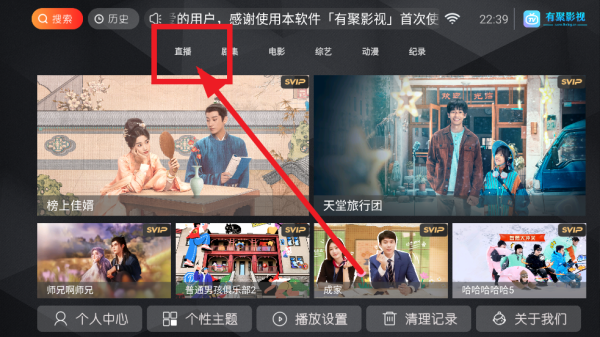 4、进入直播板块后默认打开的就是CCTV1频道;
