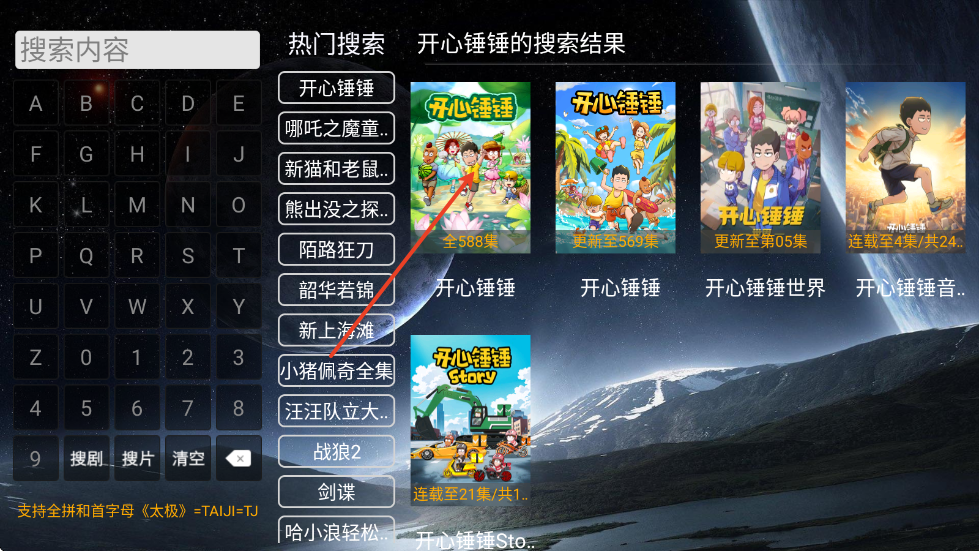 2.在弹出的左侧输入框中,输入想要查找的影视剧名称的首字母;
