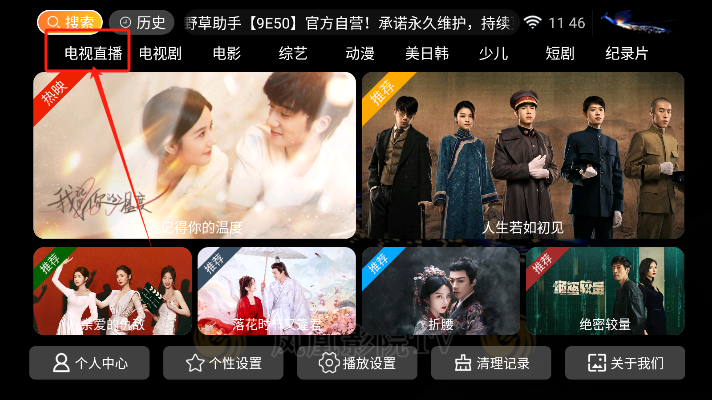 3、点击按钮进入对应专区后,选择对应板块,就到了电视直播的播放区域